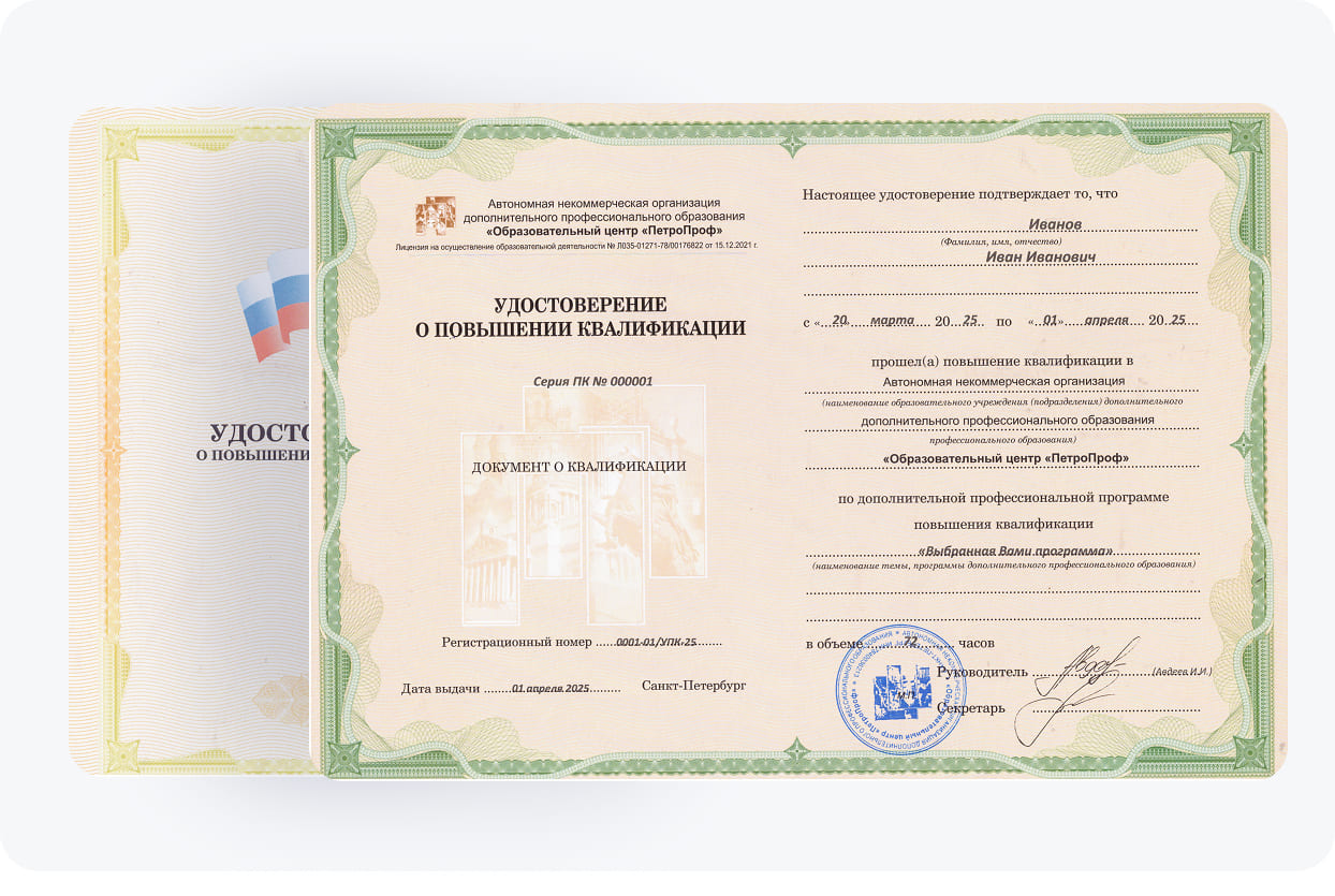 Завершив обучение музыкальным-теоретическим дисциплинам, каждый слушатель получит удостоверение о повышении квалификации (УПК). Этот документ об образовании подтверждает ваше право вести педагогическую деятельность в области музыки и гарантирует работодателям высокий уровень вашей подготовки. Важно отметить, что учебная организация «ПетроПроф» имеет официальную лицензию.